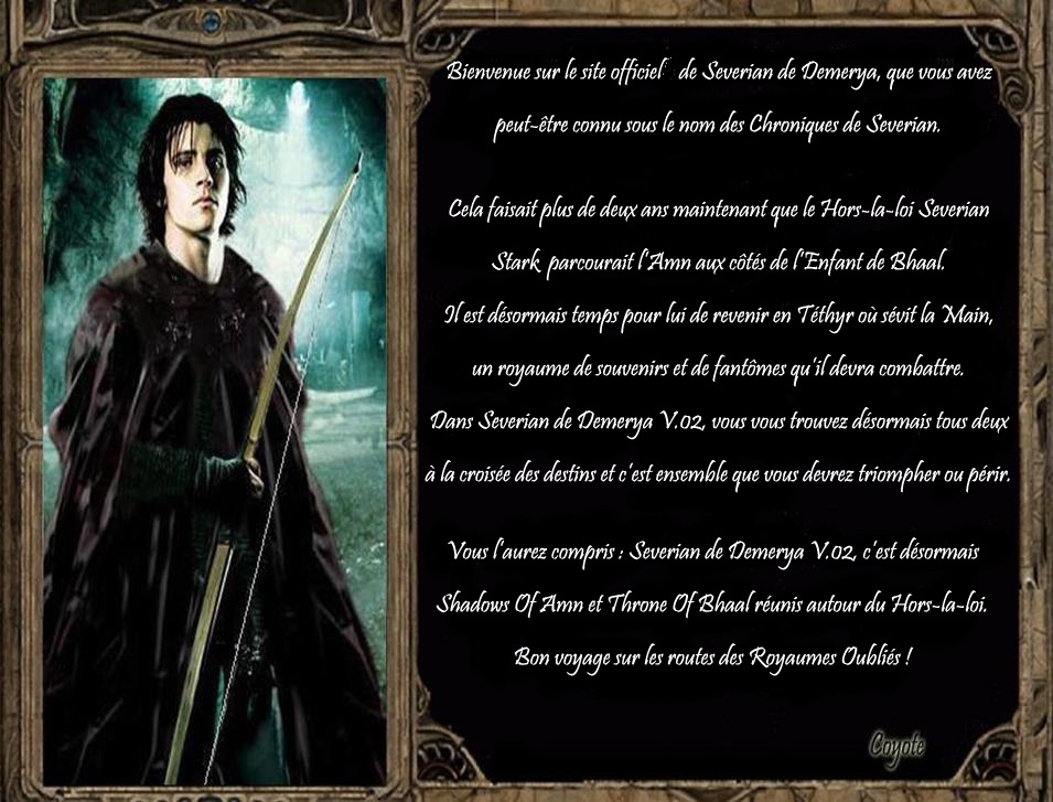 Aujourd'hui, j'ai le plaisir de vous annoncer son réhébergement officiel et pour le télécharger, rendez-vous donc dans la rubrique "Severian de Demerya" ! De même, je reprends également du service pour assurer moi-même la maintenance de mon mod, que j'avais malheureusement quelque peu délaissé. Je serai donc là pour vous accompagner, par email ou sur le forum de la Couronne de Cuivre, en cas de besoin.